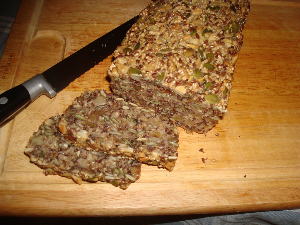 Massen kommes i en smurt form og bages ved 160 gr i 1 time. Oliven kan erstattes med fx hasselnødder og tranebær.